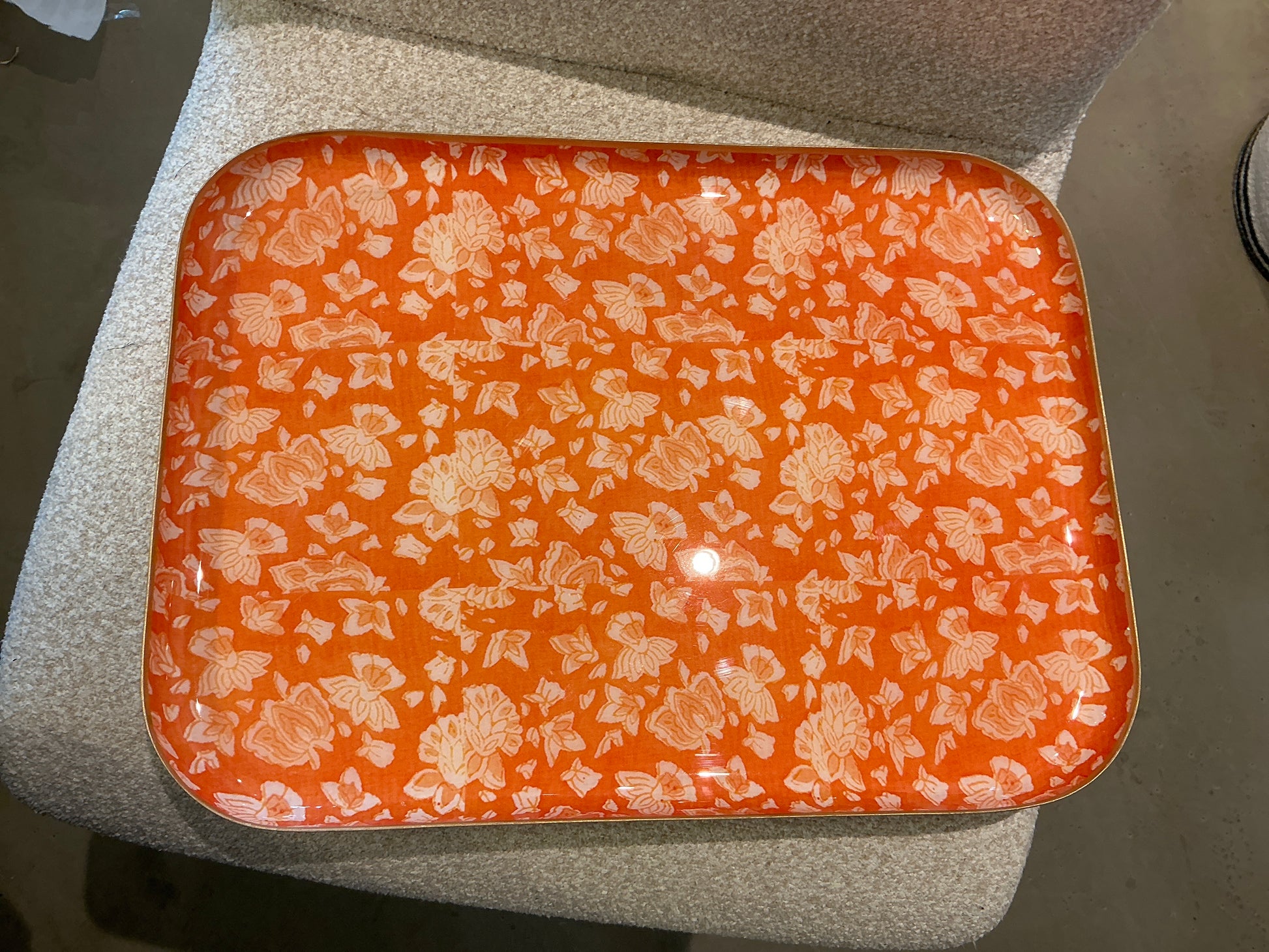 Ce plateau en métal émaillé est recouvert d'un motif bohème chic à fleurs, il est entouré d'une bordure dorée à la main. Pièce unique, façonnée des mains des artisans indiens, face arrière unie.